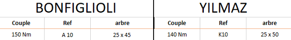 Toutes les informations ne vous sont données qu'à titre indicatif et ne pourront engager notre responsabilité. Nous vous remercions de contrôler l'ensemble des côtes (diamètre d'arbre, hauteur d'axe, fixation bride ou pattes...).